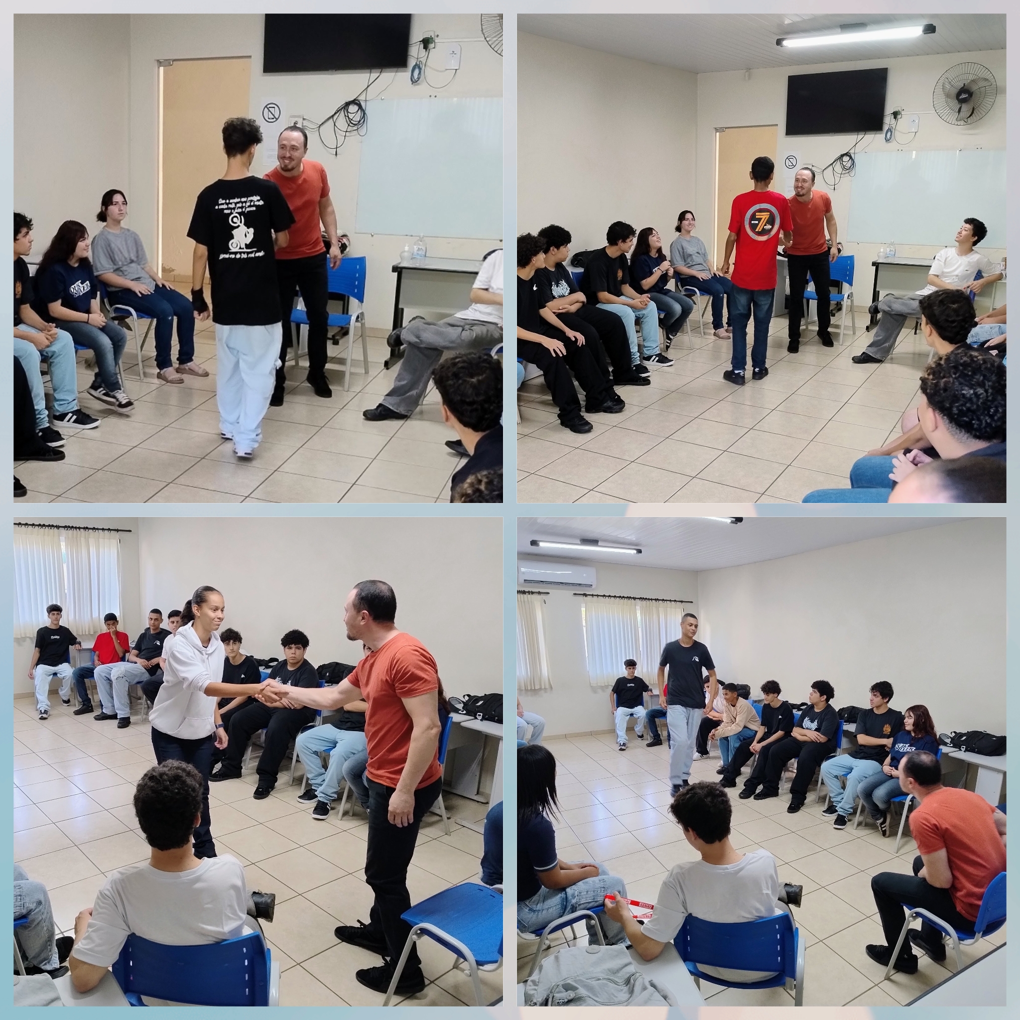 Por meio das dinâmicas, os adolescentes puderam trabalhar a desenvoltura, a segurança ao se expressar e a interação em situações de atendimento. A proposta favoreceu a participação ativa dos jovens e contribuiu para o fortalecimento de competências essenciais no contato com o público, preparando-os para atuar com mais confiança e profissionalismo.